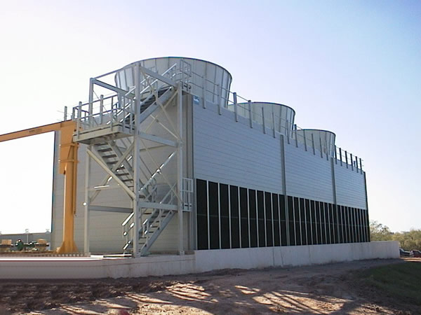 玻璃鋼冷卻塔是指可將水冷卻的一種裝置。水在其與流過的空氣進行熱交換、質(zhì)交換,致使水溫下降。 開式玻璃鋼冷卻塔是利用水和空氣的接觸,通過蒸發(fā)作用來散去工業(yè)上或制冷空調(diào)